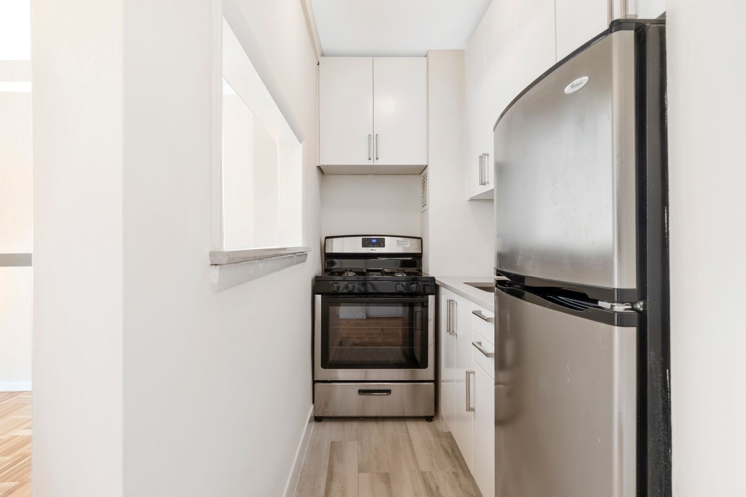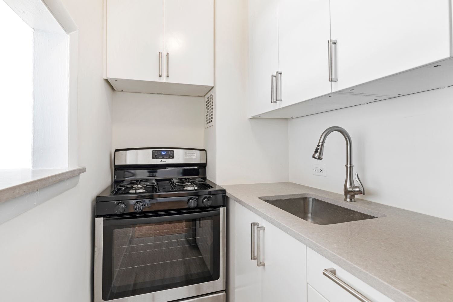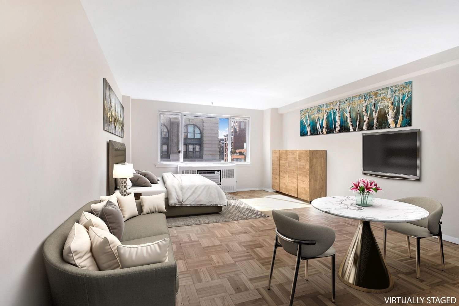 When you step into this sunny, gut-renovated studio apartment, you immediately feel like you are in a brand-new home. You will love the sunny, eastern exposure; the new, quiet casement windows; and the upbeat cityscape views. As you enter the apartment’s foyer, to your right you will notice an all-new, pristine renovated bathroom, tons of closets, and storage to your left and right. You are then greeted by a sleek renovated kitchen with a convenient breakfast bar; and you will note every detail has been very carefully planned. The apartment is large enough for distinct eating, living, and sleeping spaces that make this studio apartment really feel like the home you are seeking!
