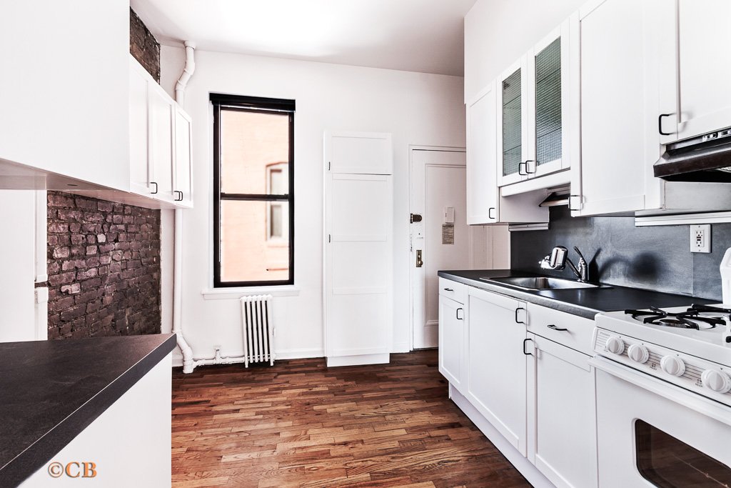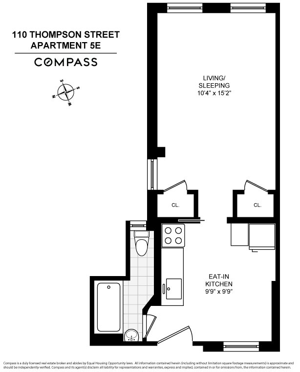 This charming studio is located on a tree lined street at 110 Thompson Street in Historic Soho, this neighborhood is known for its architecture, galleries, and wonderful shops and restaurants. If you like light and location this is the apartment for you. Enter this freshly painted bright airy studio, The 5th floor is 4 flights up from the lobby. The kitchen faces west, with a space for a breakfast table and/or work area. To the right of the kitchen is a windowed bathroom. Leading to the Living/Sleeping area is a sliding door flanked by two spacious closets, there is enough space to comfortably set up a lounge area and separate bed and side tables. The two windows in this room face east with open views and excellent light. The north window faces an air shaft and is perfect for an a/c which is already installed. If you want a new kitchen and bathroom bring your contractor and make this apartment yours.