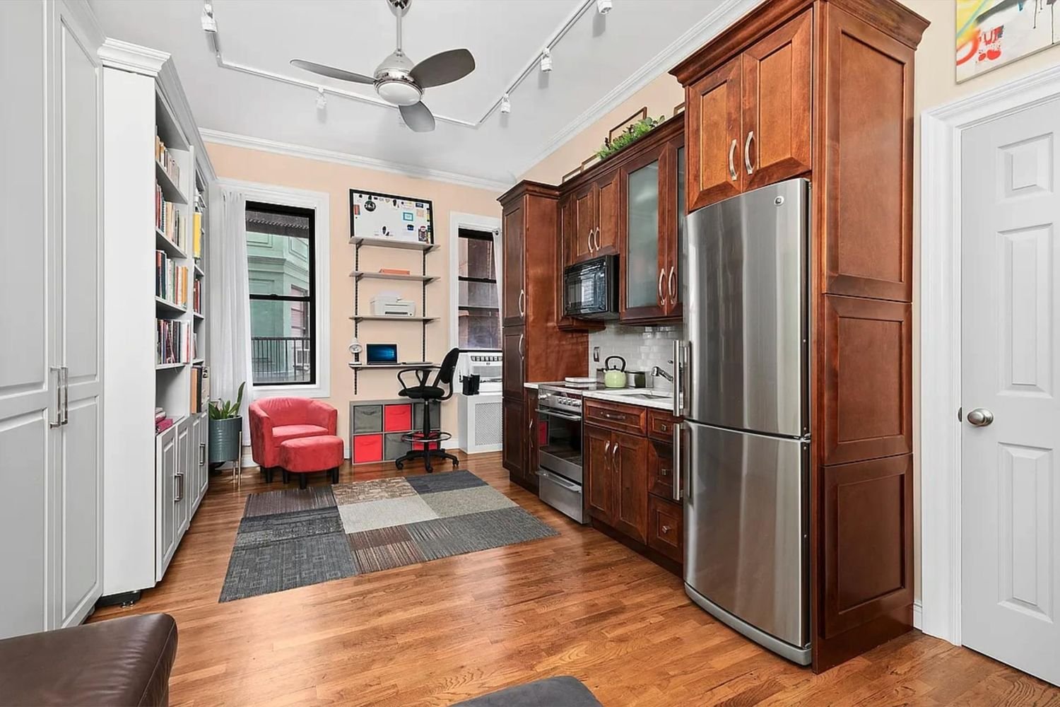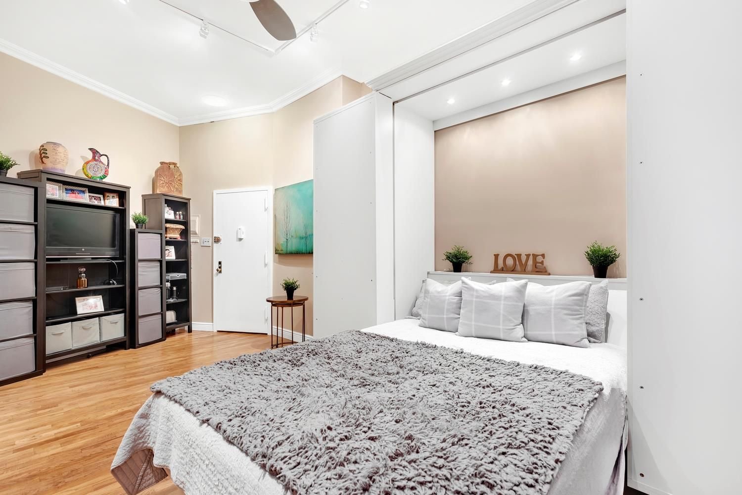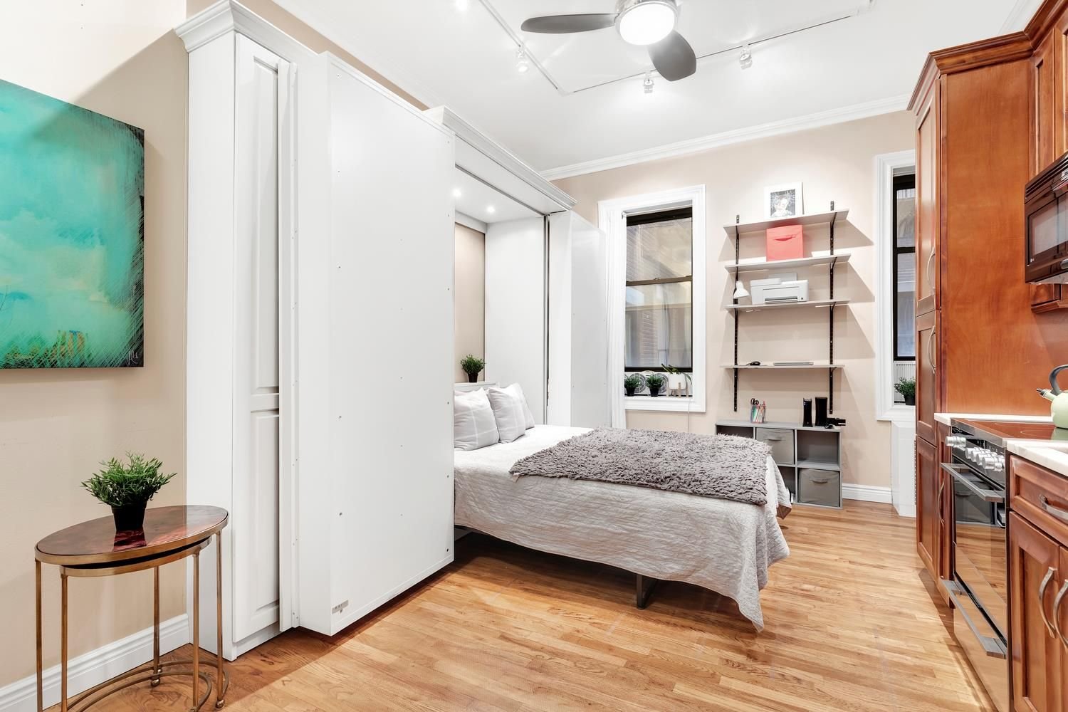 Perfect Lincoln Center Pied-a-Terre or Starter Apt with High 10.5 Foot Ceilings and Open Space! Beautiful Prewar Studio Home at “Lincoln Spencer Apts” has an Exquisite, Renovated High End Kitchen, and Murphy Bed with Storage. Best Space and Volume in a Studio for the price! Apartment features Hardwood Floors, Crown Moldings, Track Lighting, Overhead Ceiling Fan, Windowed Bathroom, and Space for Dining. The flexible Open Living area includes a built in bookcase which opens to unfold a murphy bed with sufficient room for an entertainment area and eating area. The kitchen is designed with gorgeous custom cabinetry and high end appliances. The walk in closet also incorporates custom built-in shelving. 140 West 69th Street (The Lincoln Spencer) is a Much Loved, Prewar, Beaux-Arts Building with 24 Hr Doorman, Live-in Super, and Full Service Staff. After 5 years of residency, shareholders are allowed to Sublet Indefinitely, with board approval. Pied-a-terres are Welcome and Buyers can purchase with Guarantors. Dogs are allowed with certain limitations on size/breed (pls inquire). Co-op has Excellent Financials. No Flip Tax. Proximate to Lincoln Center, Central Park, the Best UWS Restaurants, Boutique Shops, Equinox Sports Club, and easy access to transportation. Best Block Association in the Heart of the UWS!