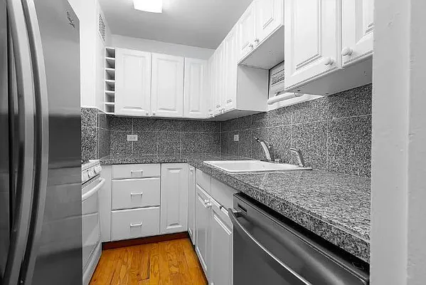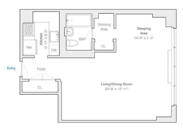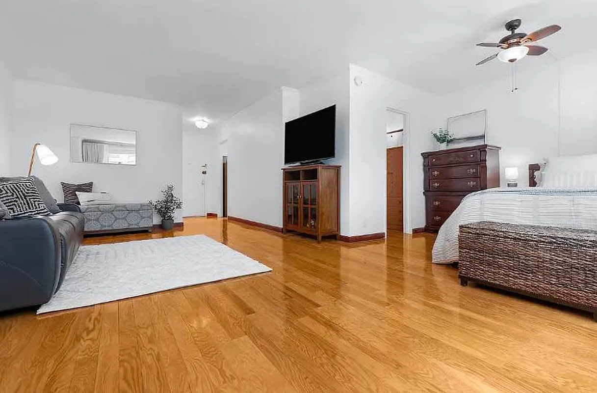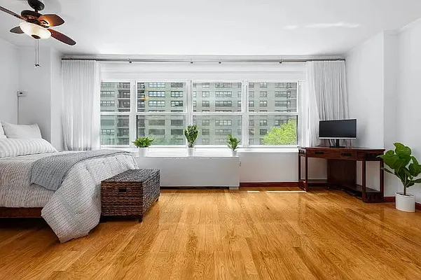 This oversized alcove layout separates sleeping area and ample living area. The southern exposure splashes warm sun over new hardwood floors all day long, while the window offering wonderful views of courtyard and skylines. Full-sized appliances in kitchen and full bathroom with pass-through, walk-in closet. This perfect unit also features ceiling fan, thermostat control, and state-of-the-art automatic blinds. Even better, the utilities included in maintenance.