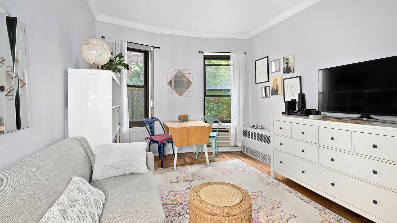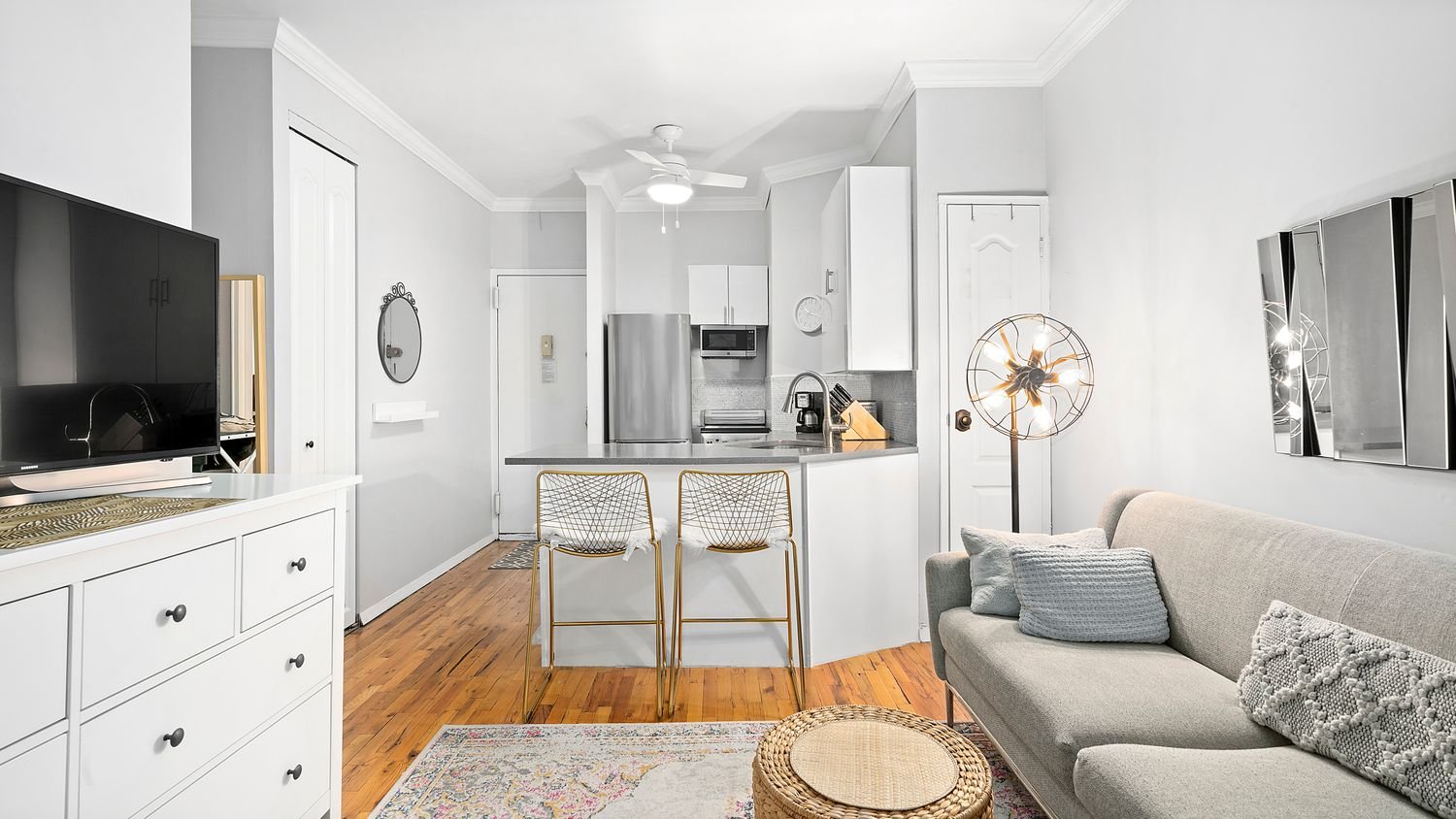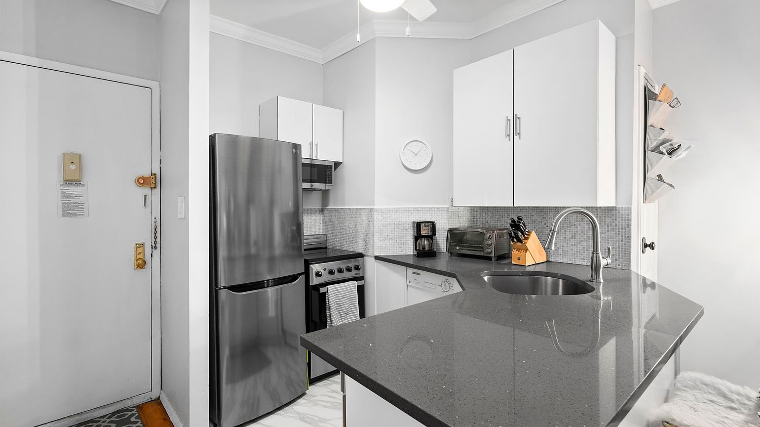 Upon entering the space, you are greeted with a renovated kitchen. White stone tiles cover the kitchen floor, along with new white cabinets, contrasted by a black granite countertop. New stainless-steel appliances are complimented by a pebble backsplash. The kitchen flows into the living room, which has well-preserved oak hardwood floors and 9’ ceilings. 2 large windows allow for a nice breeze. An in-wall air conditioner is conveniently installed under the window to allow for maximum light.