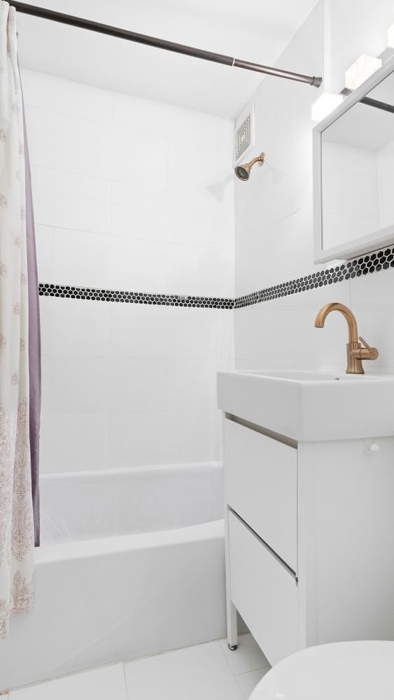 The bathroom was also tastefully renovated in all white, with a pebbled black accent and fitted with brass fixtures.