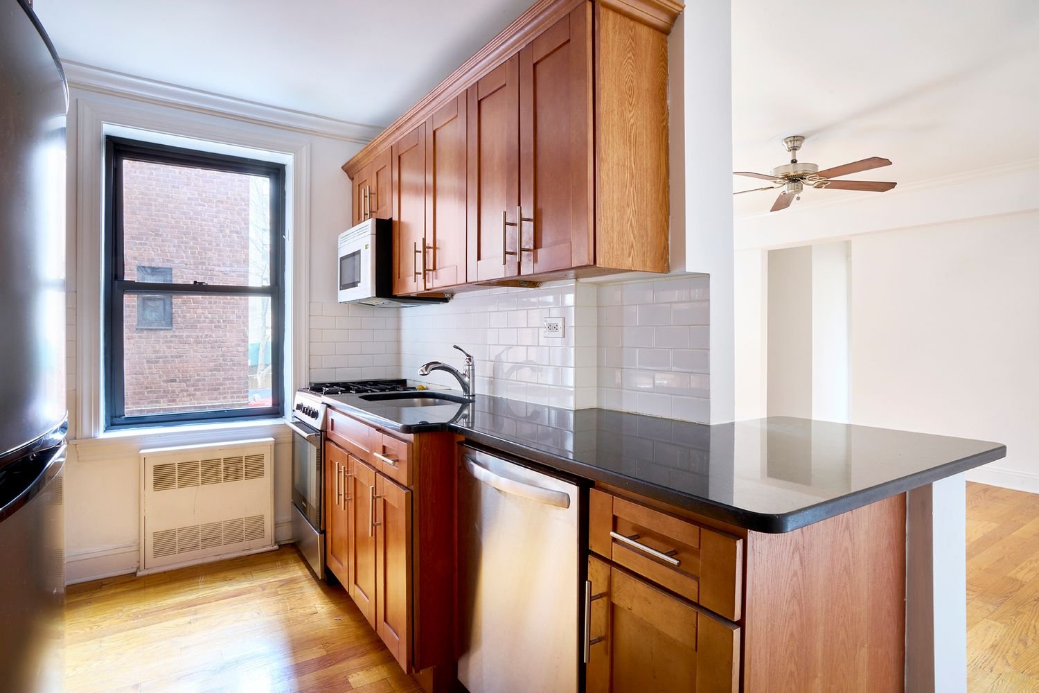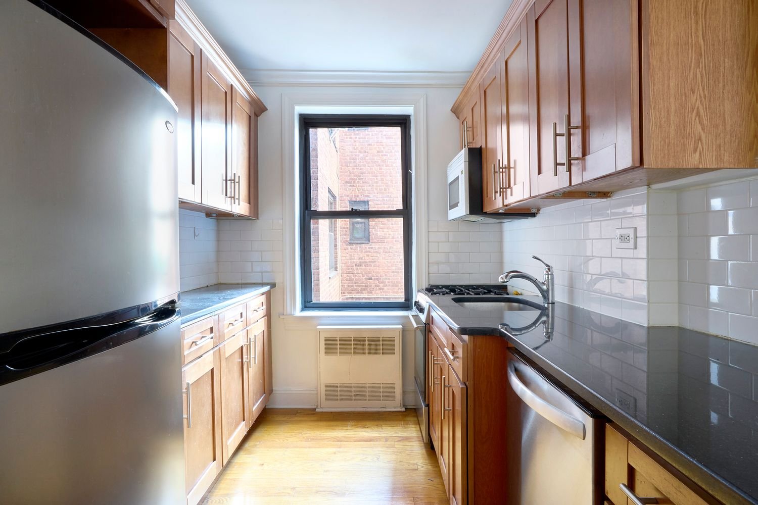 The apartment features large and open living space and impeccably maintained hardwood floors throughout. The separate windowed kitchen showcases gorgeous granite countertops and stainless steel appliances, including a dishwasher. The massive king sized bedroom has two sets of windows making it a tranquil respite. The well appointed windowed bathroom is spacious and inviting. Ample closets and storage space throughout the apartment really tie everything together, making this a great home.