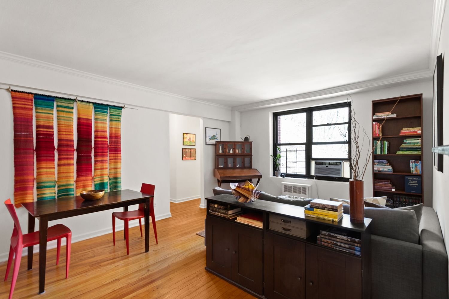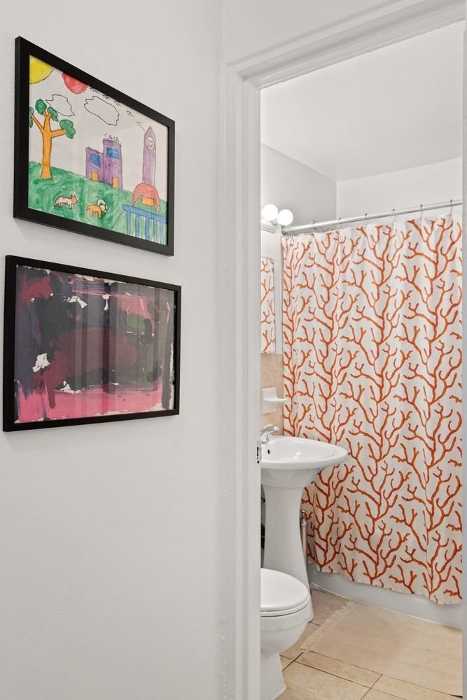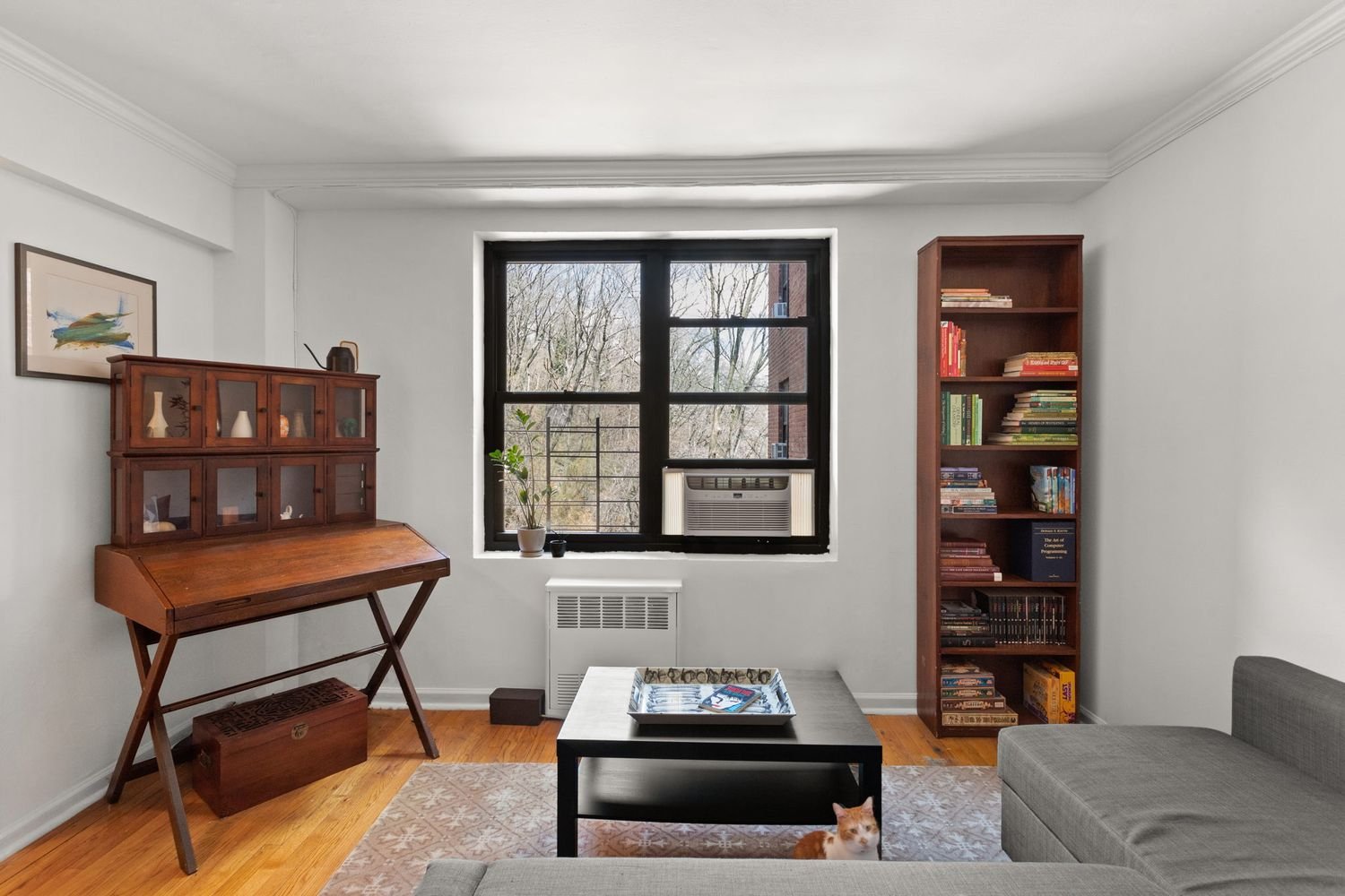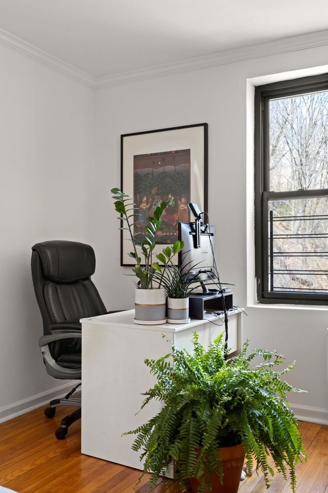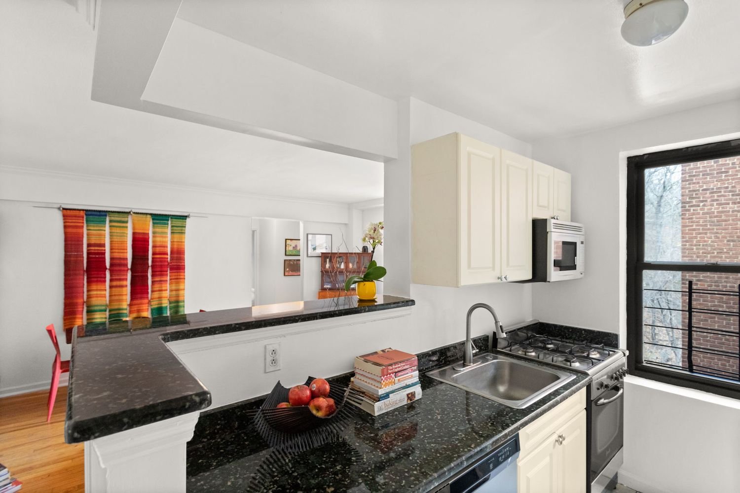 As you drop your bag and shoes in the foyer, too worn out from a lively New York day to deposit your dunnage in the entry closet, you peer over the kitchen counter, through the living room, and out of the oversized windows at the blossoming trees of Fort Tryon Park, practically your front yard.