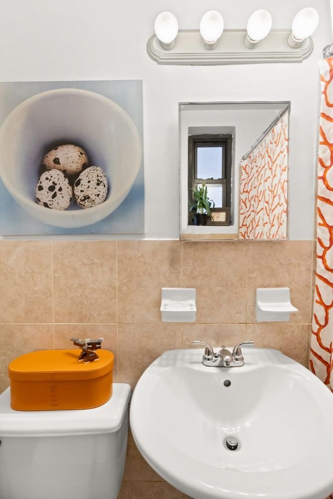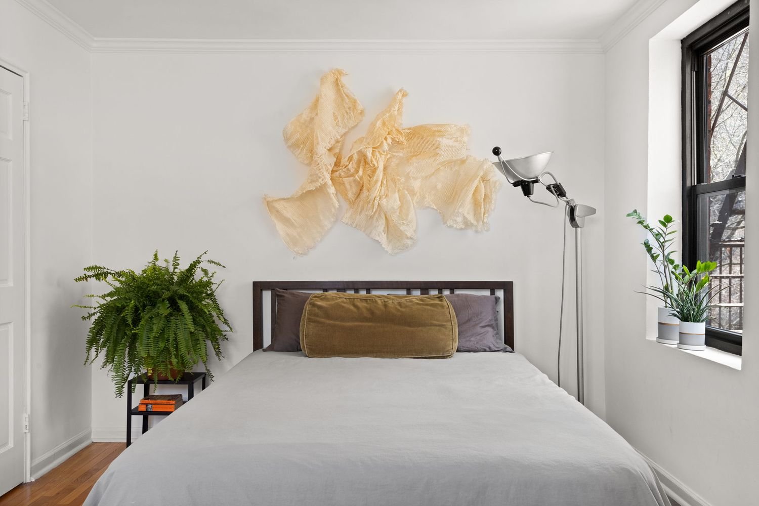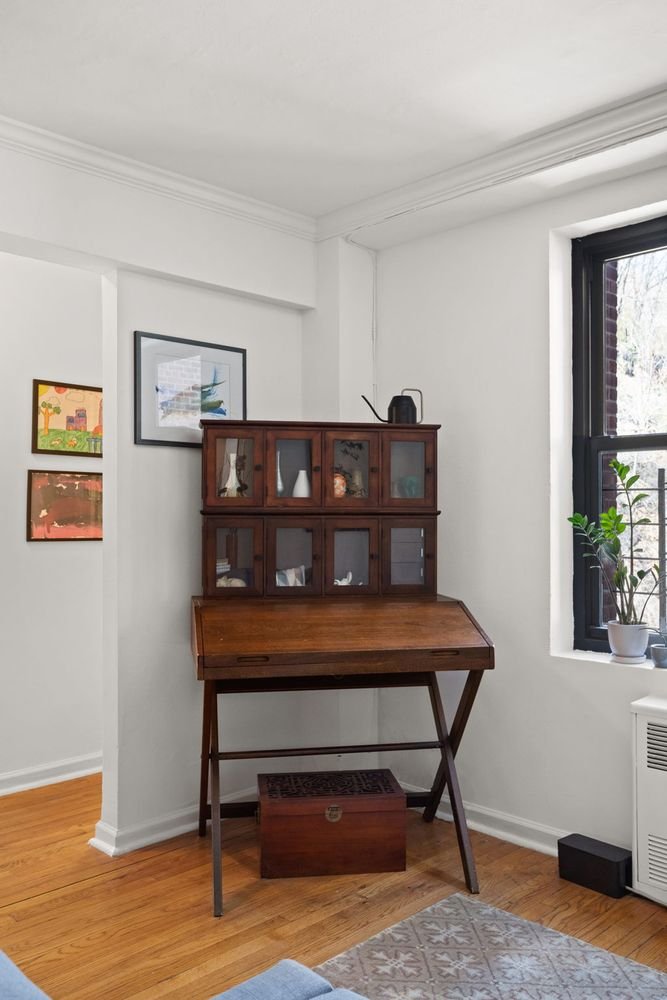 Once you wrap your day and move through the closeted hallway, past the windowed bathroom, into the bedroom, you can flop down on your bed or take a seat on a chaise dotted by windows on either wall with northern and western exposures. This corner vantage looking out over Bennett Avenue and Fort Tryon Park is the ideal quiet perch to take a deep breath and unwind.
