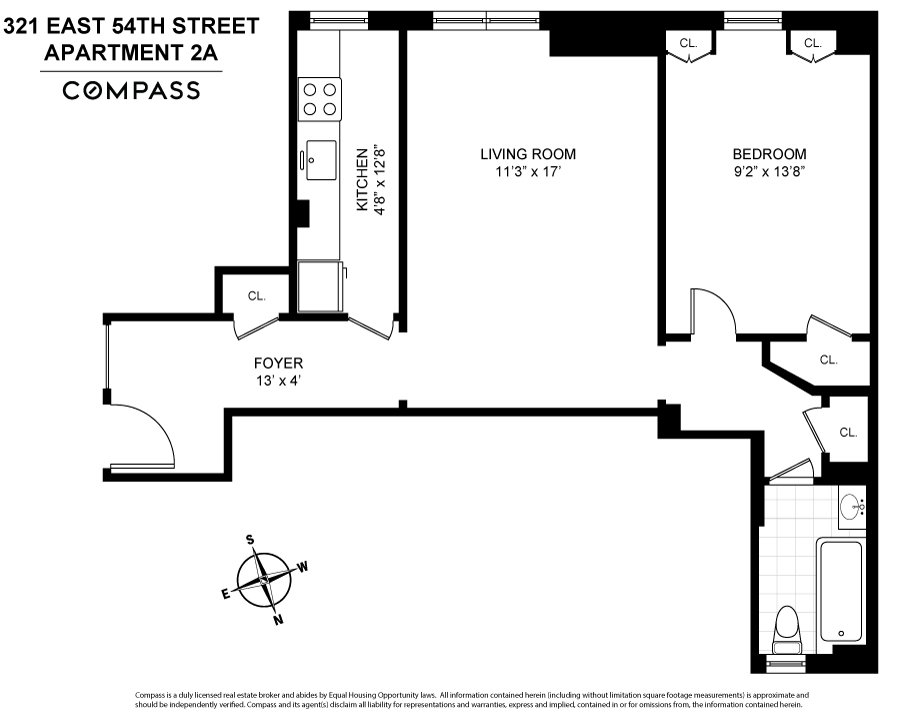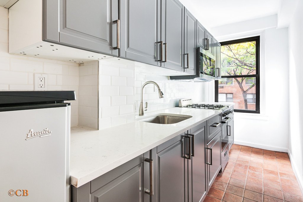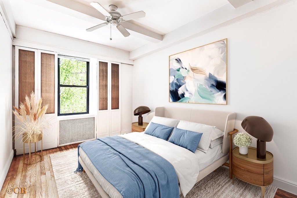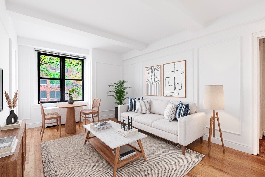 THIS IS AN ESTATE SALE BRING your Contractor and make this home your own. This apartment is VIRTUALLY STAGED it has the potential of being charming as it has a lot of prewar details, Enter the apartment into a small vestibule, with room for a table and coat tree, to place your keys, and outer garments. Opposite the vestibule is a closet. As you continue down the hallway you will see a windowed galley kitchen on your left with brand new cabinets that were recently installed. With the exception of the bathroom the WHOLE APARTMENT FACES SOUTH overlooking the tree-lined street, 54th street, a very quiet block. Hi beamed ceilings and picture mouldings furnish the living room.The bedroom has a closet and two built in bookcases and can accommodate a King Size bed. The windowed bathroom needs updating it has a closet outside and is “the only window: that faces north. The wood floors throughout the apartment were recently sanded and stained. The apartment is an ESTATE property and is sold “as is” The Estate is offering one year’s current maintenance at closing” Virtually staged.