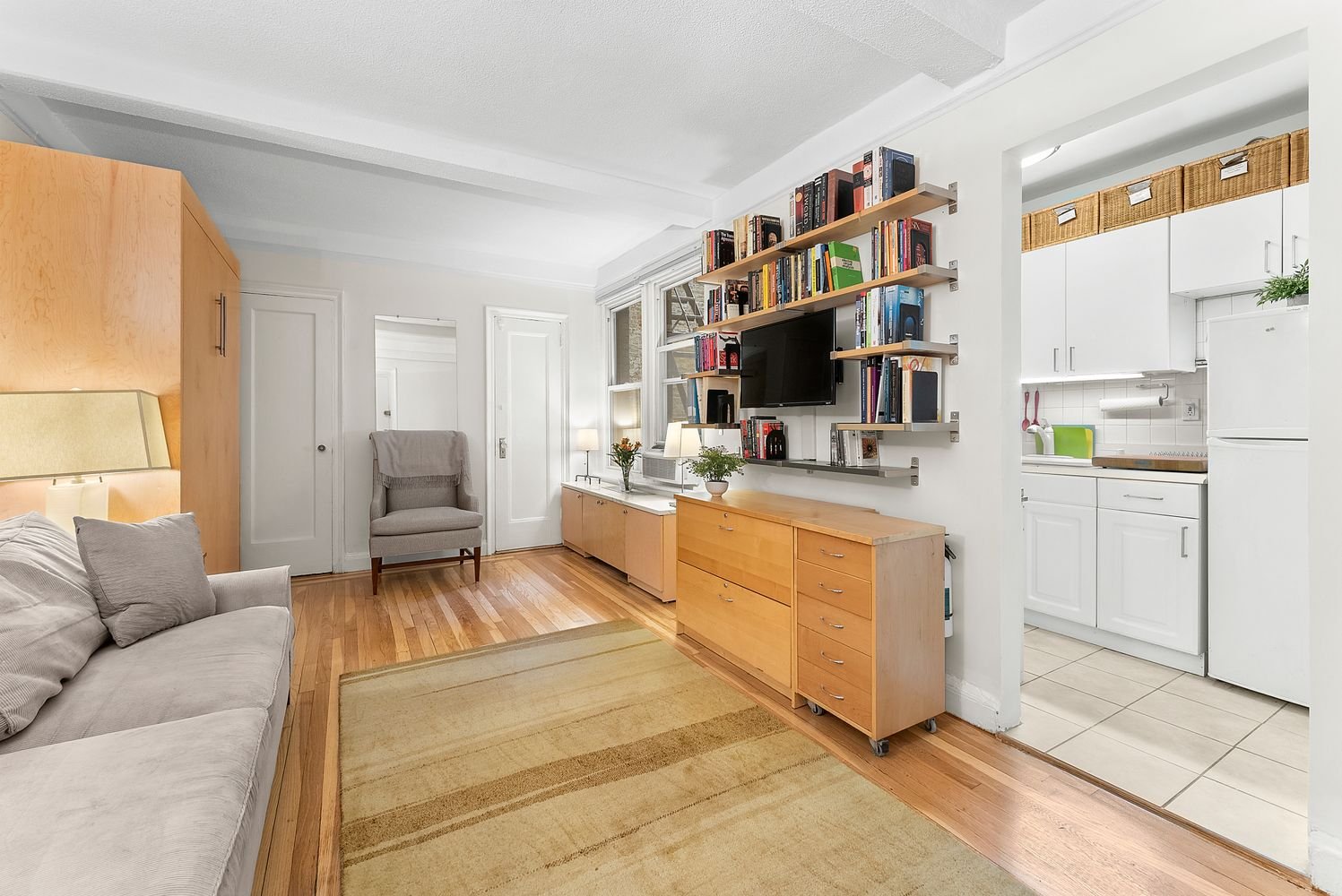 As you enter the apartment you come into the foyer and then walk into the main room. The high beamed ceilings, and the just renovated hardwood floors catch your eye. It is well-laid out and currently has a murphy bed. There are two closets and four double-paned windows. The windowed bathroom has been recently renovated, and the windowed kitchen has plenty of cooking space and cabinets.