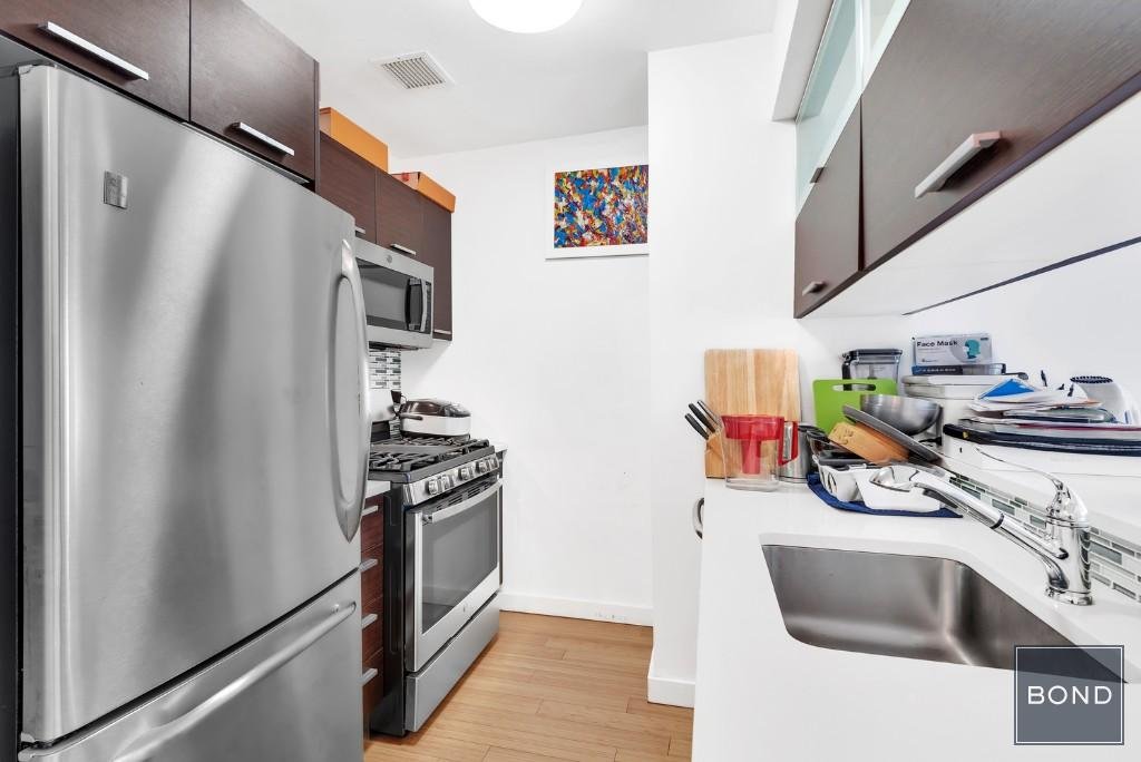 Investor Friendly Condominium – Certified Green Leed Building – 498 interior SF 1 Bedroom – Elevator – 4″ Wide Plank Light Colored Wood Flooring – Private 110 SF Balcony – Overhead Lighting – State of The Art Kitchen – White Quartz Countertops – Large Undermount Sink – Stainless Appliances Including a 6 Burner Stove – Large Fridge – Breakfast Bar – Glass Backsplash – In Unit Bosch Washer Dryer – Bathroom Includes – Deep Soaking Tub – Tile Walls and Floor – Double Entrance From the Living Area and From The Bedroom – 2 Walk in Closets – 4 Total Closets – Building Amenities Include – P/T Doorman and a Virtual Video Intercom – Onsite Super – Fitness Room