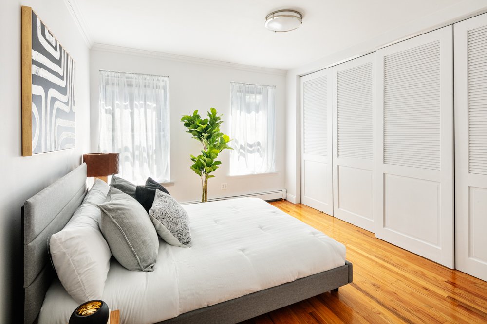 The full sized cook’s kitchen is truly unique among similar apartments. Loads of cabinets, a pantry and a closet – and that’s just in the kitchen. Another game changer? An entire wall – floor to ceiling – of closets in the primary bedroom. Elfa shelving utilizes the space to the max, and it is fully modular to customize for your own needs. Additional storage in the basement.