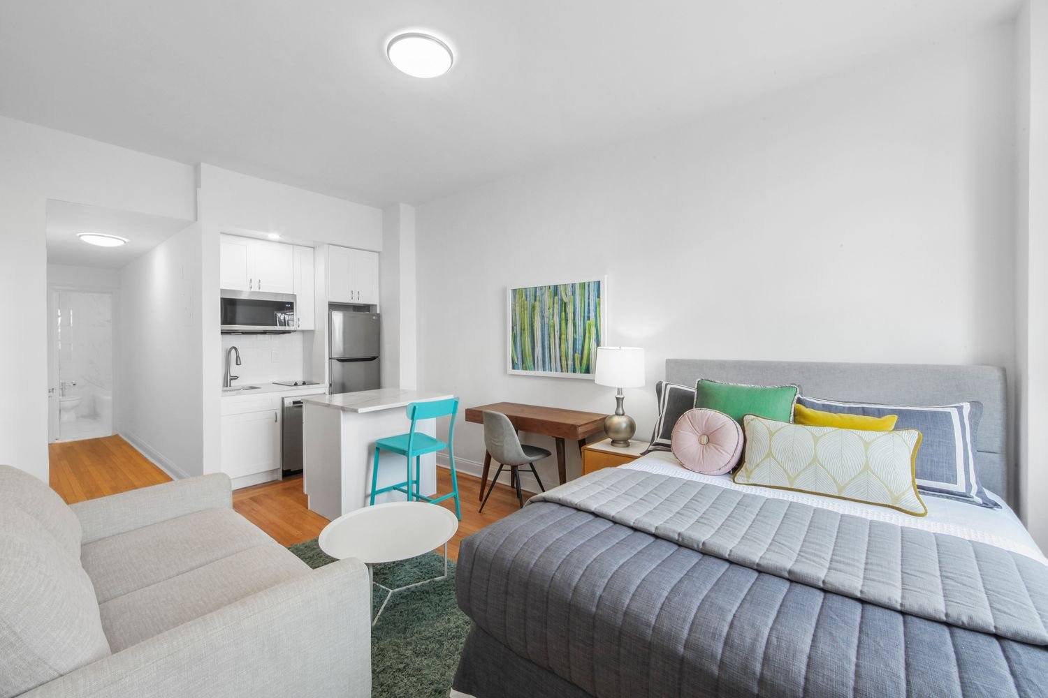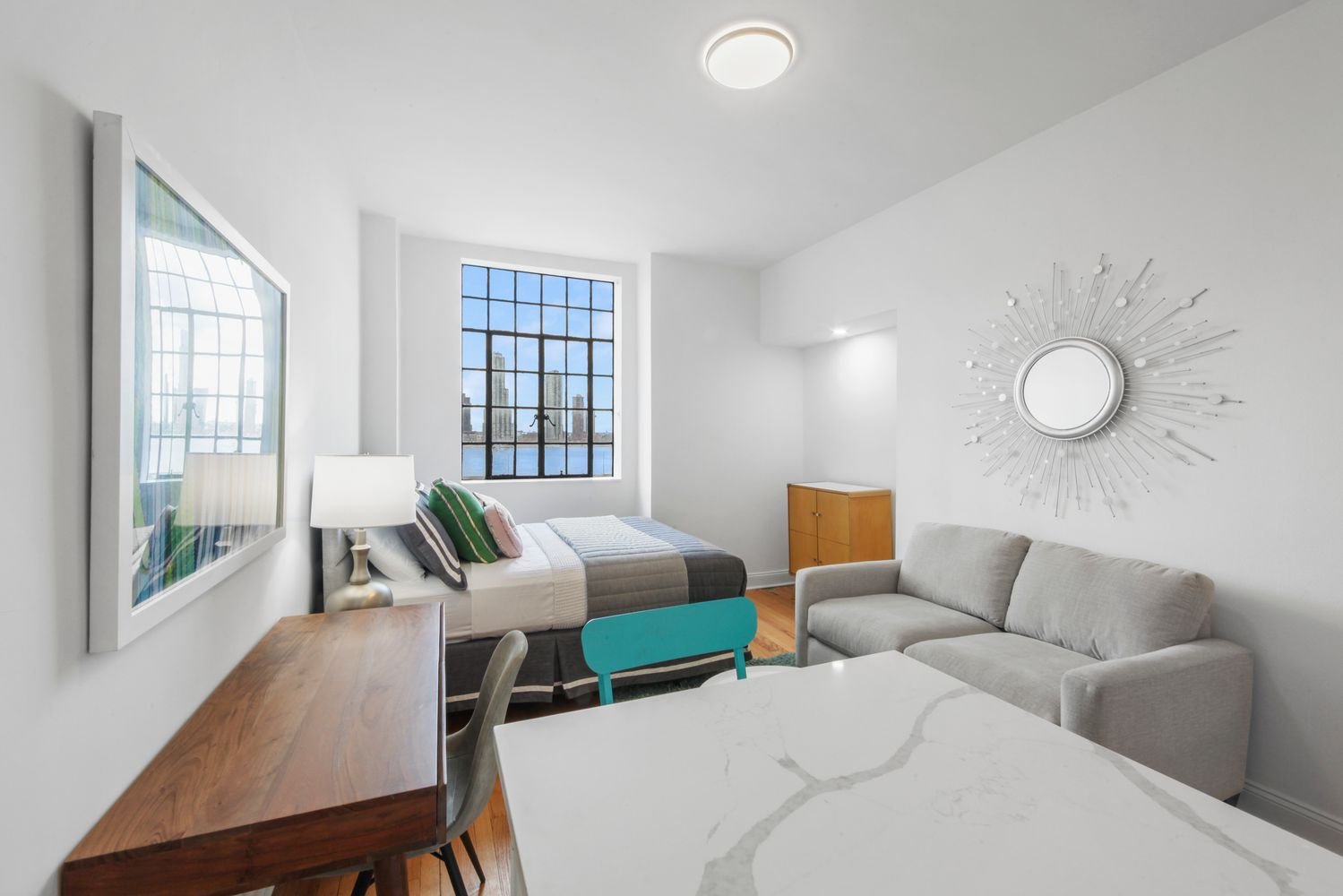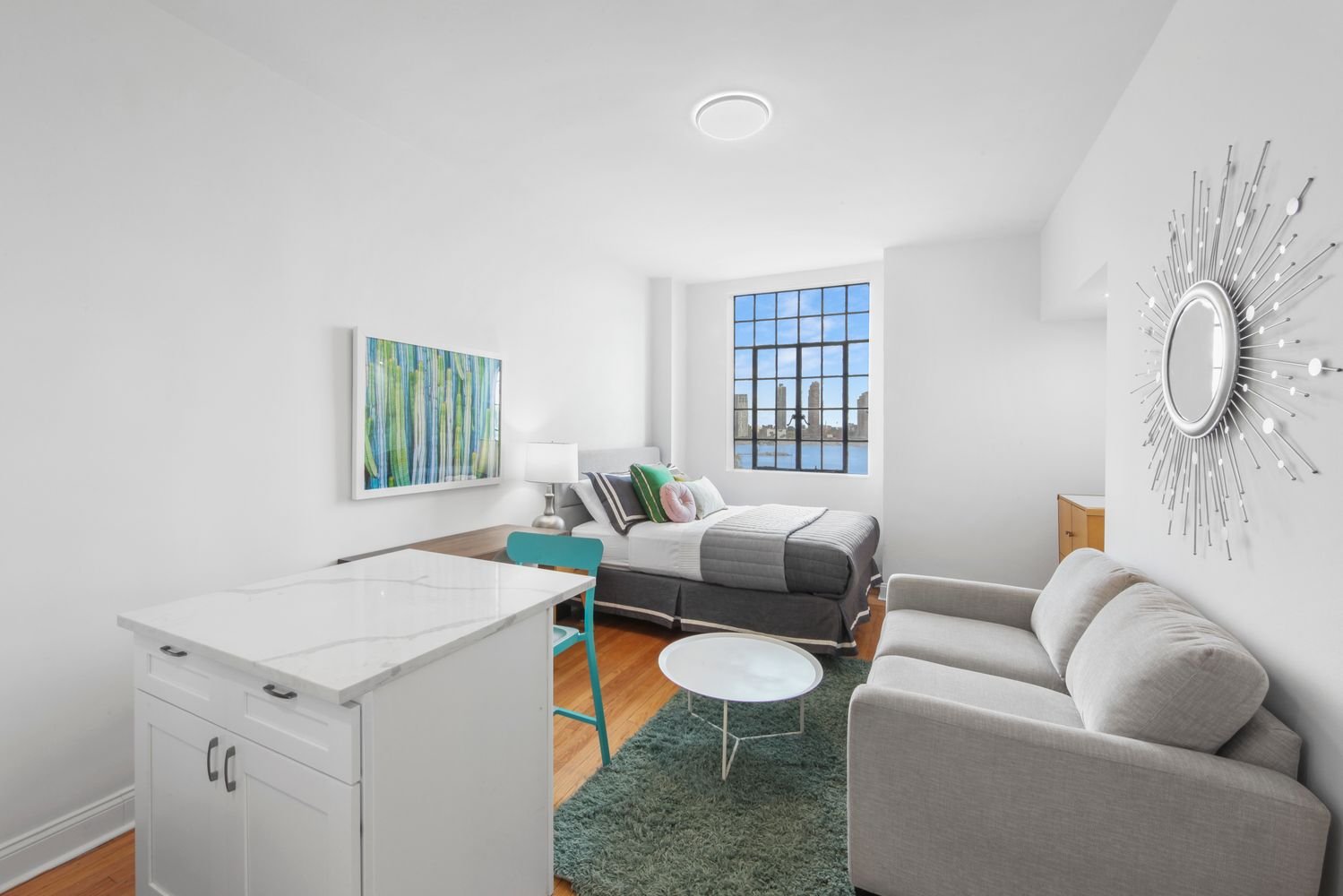 One of the most desirable towers in Midtown East’s stately Tudor City complex, this 24-hour doorman building is equipped with on-site laundry and a 2,000-square-foot updated gym with river views. The prime location overlooks United Nations Plaza, with multiple leafy green parks just blocks from the apartment. Grand Central Station provides rapid transportation to anywhere in New York and the building has great proximity to Midtown’s office buildings. Pets are allowed with board approval & the building is Smoke-Free.