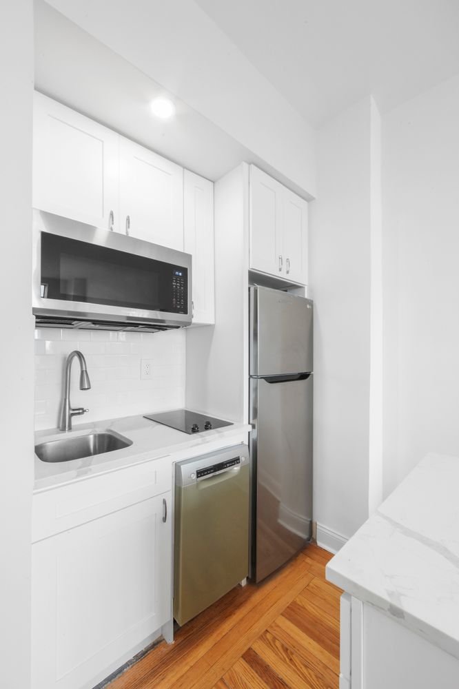 Newly renovated and in mint condition, no detail has been overlooked in this studio apartment with East River views. The renovated kitchen features an island, dishwasher, quartz countertops, subway tile backsplash, white cabinets, a two-burner electric cooktop, a full-sized refrigerator & a microwave oven. There is a wall thru PTAC unit, 3 closets, and hardwood flooring throughout. The bathroom has been fully renovated with silver fixtures, a new sink and vanity, mirrored medicine cabinet, and is tiled throughout. The apartment is located on the lobby level, 4 flights above ground level, with eastern exposure and river views.